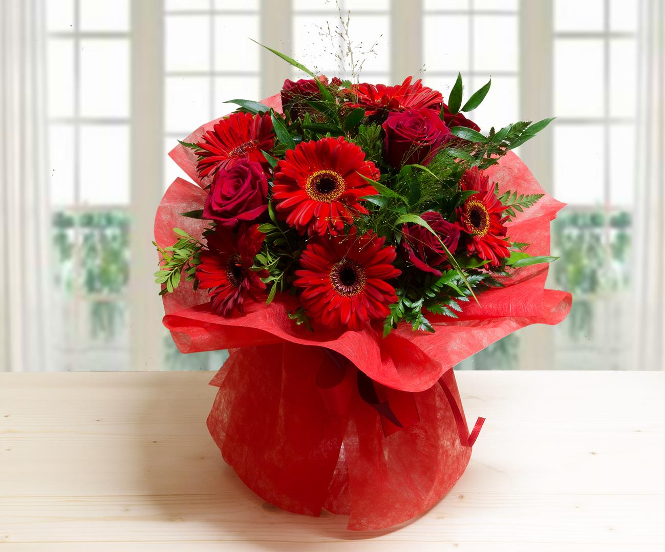 Rosso è il colore della laurea. Scegli questo bouquet di 5 rose e 5 gerbere rosse per un regalo dal fascino assicurato.