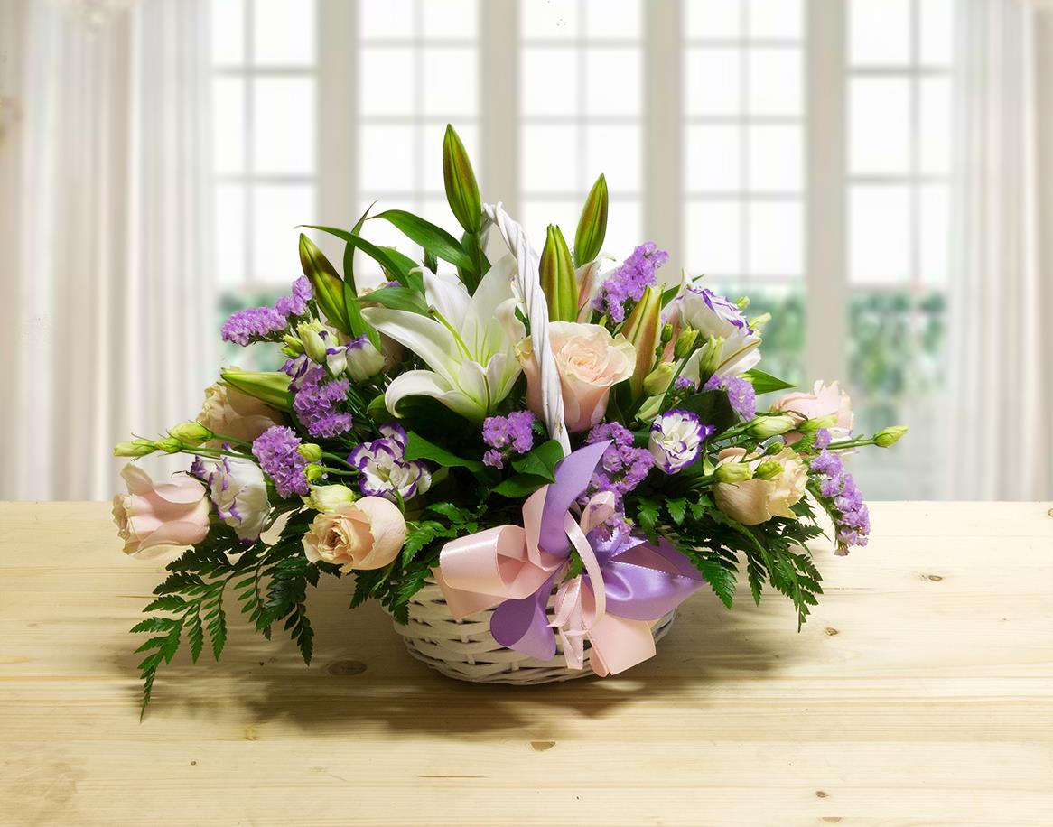 Colori delicati, dolcezza e armonia in questo cesto di lilium, rose, lisianthus e fiori di campo