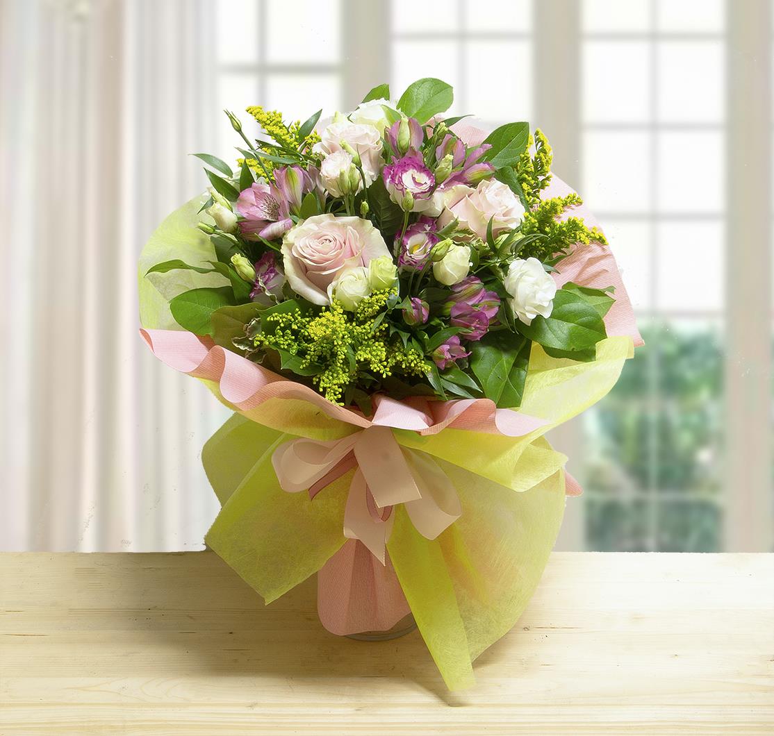 3 Rose Rosa, Lisianthus e fiori di campo in questo bouquet dolce e delicato